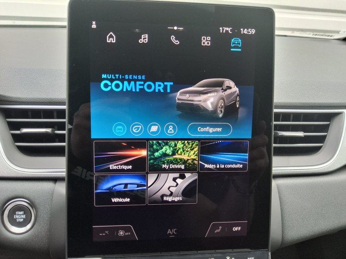 Aide au demarrage en coteAide au freinage d'urgence (A.F.U.)Aide au parking ARAirbag passager deconnectableAirbags frontauxAirbags lateraux AVAlerte detection de fatigueAlerte distance de securite - Information dans tableau de bordAlerte oubli des ceintures de securite aux 5 placesAlerte sortie de voieAllumage automatique des essuie-glacesAntenne requinAntiblocage des roues ABSAppel d'urgenceAppel d'Urgence RenaultAppuie-tetes ARBanquette AR coulissante et rabattable 1/3 - 2/3Boite de vitesse hybride multimode 6 rapportsCamera de reculCarte Renault "Mains libres"Climatisation automatiqueCondamnation centralisee des portes avec telecommande et condamnation des portes en roulantConsole centrale de rangement avec accoudoirControle de la traction (TCS)Controle dynamique de trajectoire ESCCoques de retroviseurs noir/teinte caisseDirection assisteeEclairage AV et AR Full LED Pure VisionFeux AR LED avec signature en forme de ''C'' et animation 3DFeux de stop a LEDFrein de parking electrique avec fonction Auto-HoldHarmonie noireIndicateur de changement de vitesseJantes Aluminium 18''Kit de gonflage et de reparation des pneumatiquesLeve-vitres electriques et impulsionnelsLiseuses AV a LEDLunette AR chauffanteOpenR link 10,4 access display audio avec tableau de bord avec ecran numerique et personlisable 7"Plancher de coffre mobilePoignees de portes ton caisseReconnaissance des panneaux de signalisationRegulateur de vitesse adaptatifRenault Multi-senseRepetiteurs lateraux de changement de directionRetroviseur interieur electrochromeSellerie TechnoSieges AV reglables en hauteurSysteme de detection de la pression des pneumatiquesSysteme de freinage d'urgence avanceVitres AR surteinteesVolant textile enduit graine